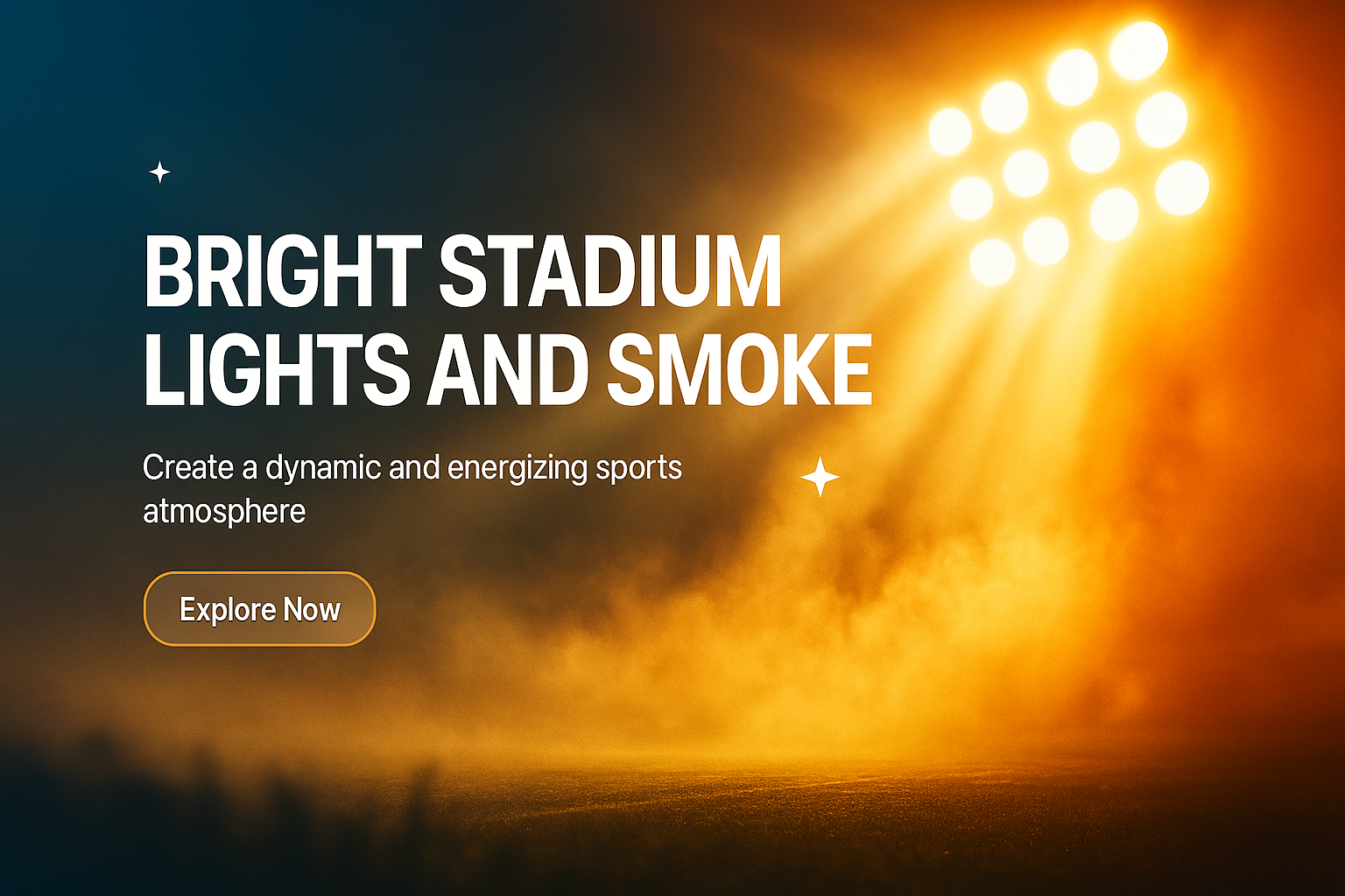 /Collection: /by davooda/Type: PNG/An electrifying scene showcasing bright stadium lights piercing through smoke, creating an energizing atmosphere. The composition balances text with dynamic lighting.