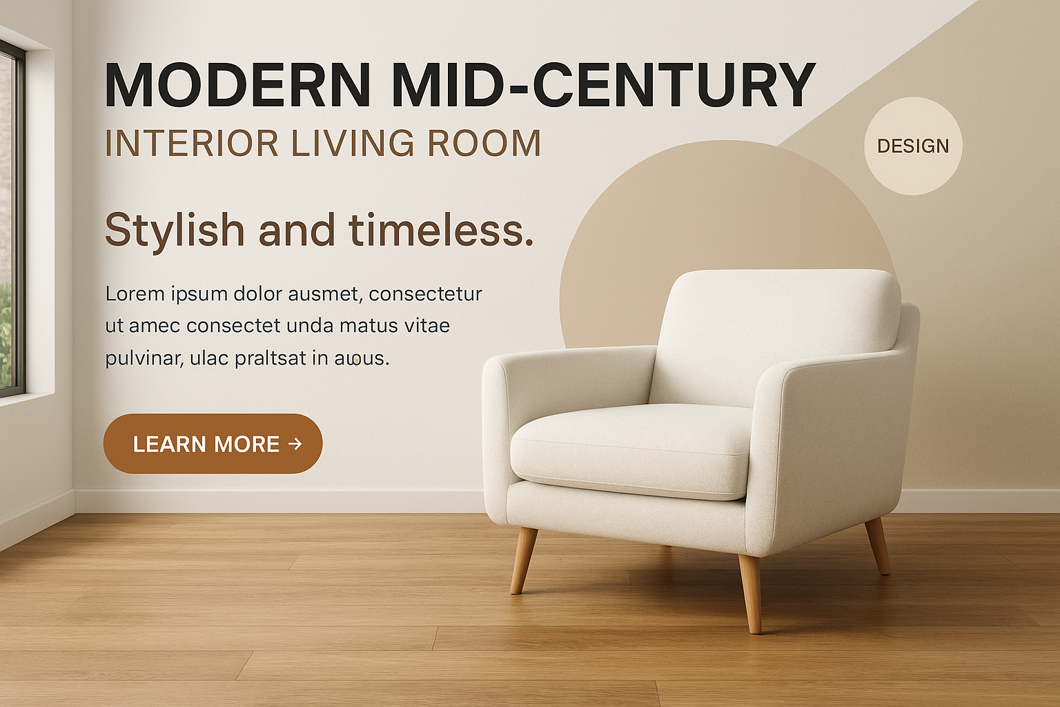 /Collection: /by davooda/Type: PNG/A stylish modern mid-century living room featuring a white armchair, wooden floor, and a layered wall design. The composition emphasizes realism and balanced aesthetics.
