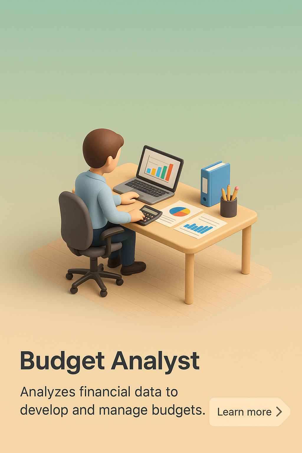 A 3D scene depicting a budget analyst working at a desk with graphs and charts. The background features a smooth gradient, enhancing the professional atmosphere.