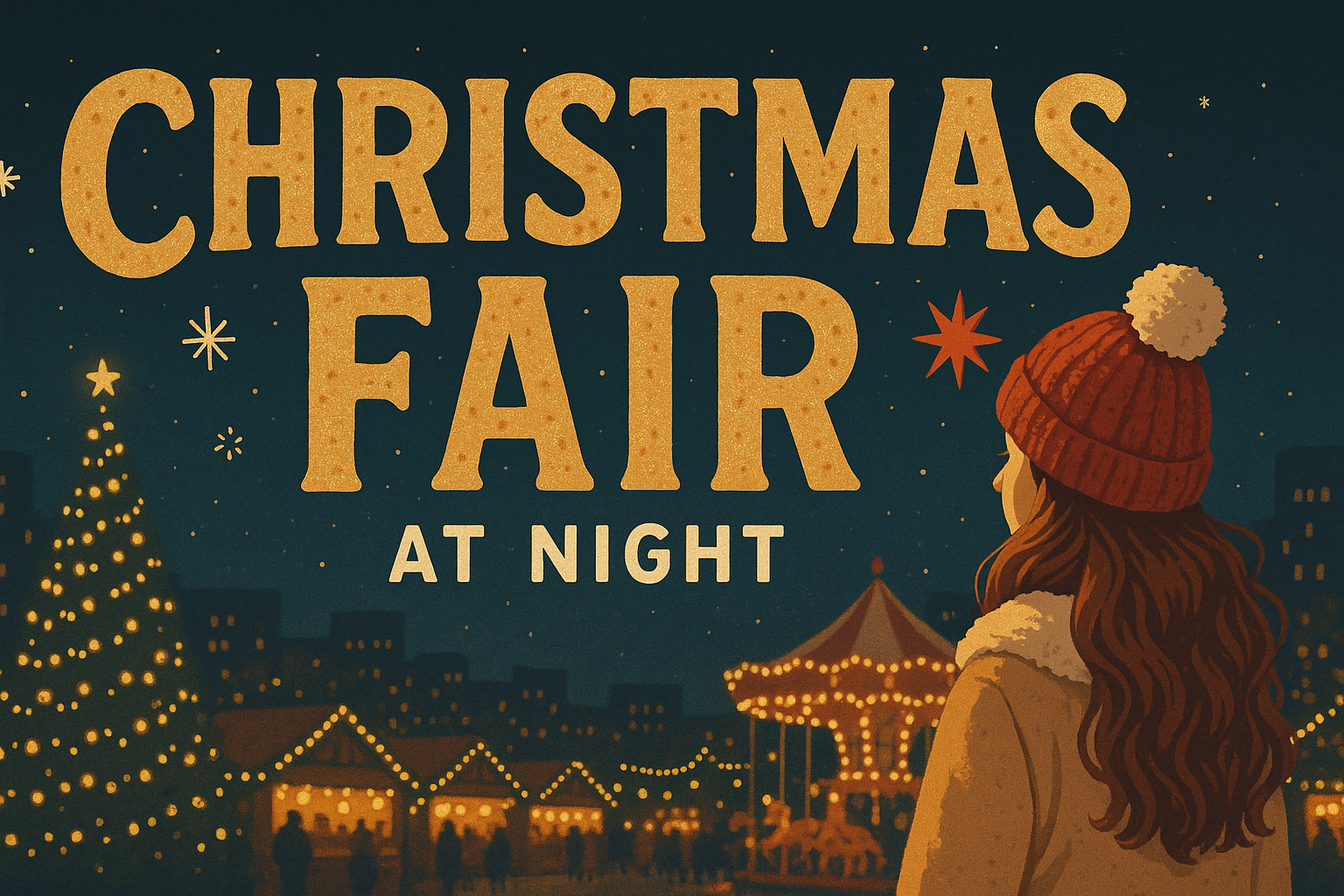 Charming illustration depicting a Christmas fair at night, featuring warm colors and a cozy atmosphere, ideal for holiday-themed marketing or event promotions.
