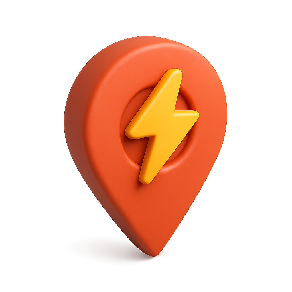 A vibrant 3D location marker featuring a yellow lightning bolt symbol on a red background, designed with a smooth, isometric style and a transparent background.