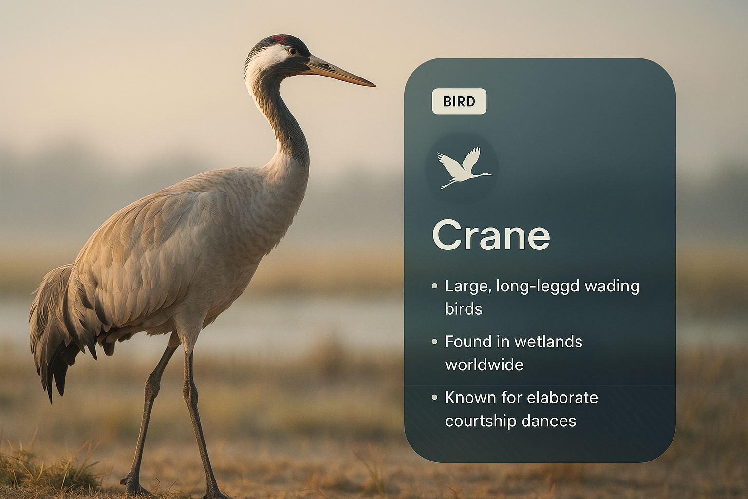 A realistic illustration of a crane standing in a wetland, accompanied by a stylish information panel detailing its characteristics and habitat.
