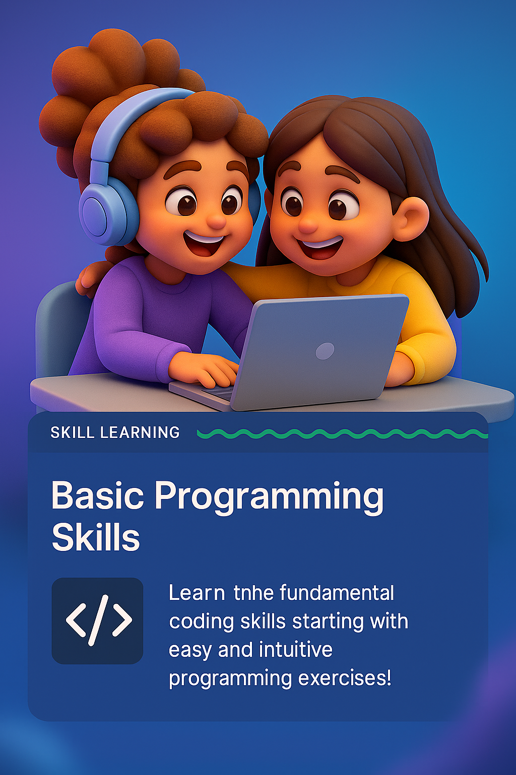 Two happy young girls sit together in a coding class, engaged in learning basic programming skills on a laptop. The colorful, inviting scene highlights their enthusiasm and teamwork.