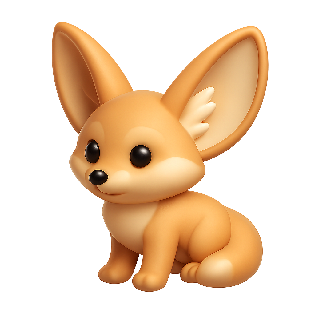 /Collection: /by davooda/Type: PNG/This image showcases a stylized 3D icon of a fennec fox, featuring oversized ears and a soft, rounded design. The fox is depicted in a three-quarter view with a smooth, volumetric look against a gradient background.