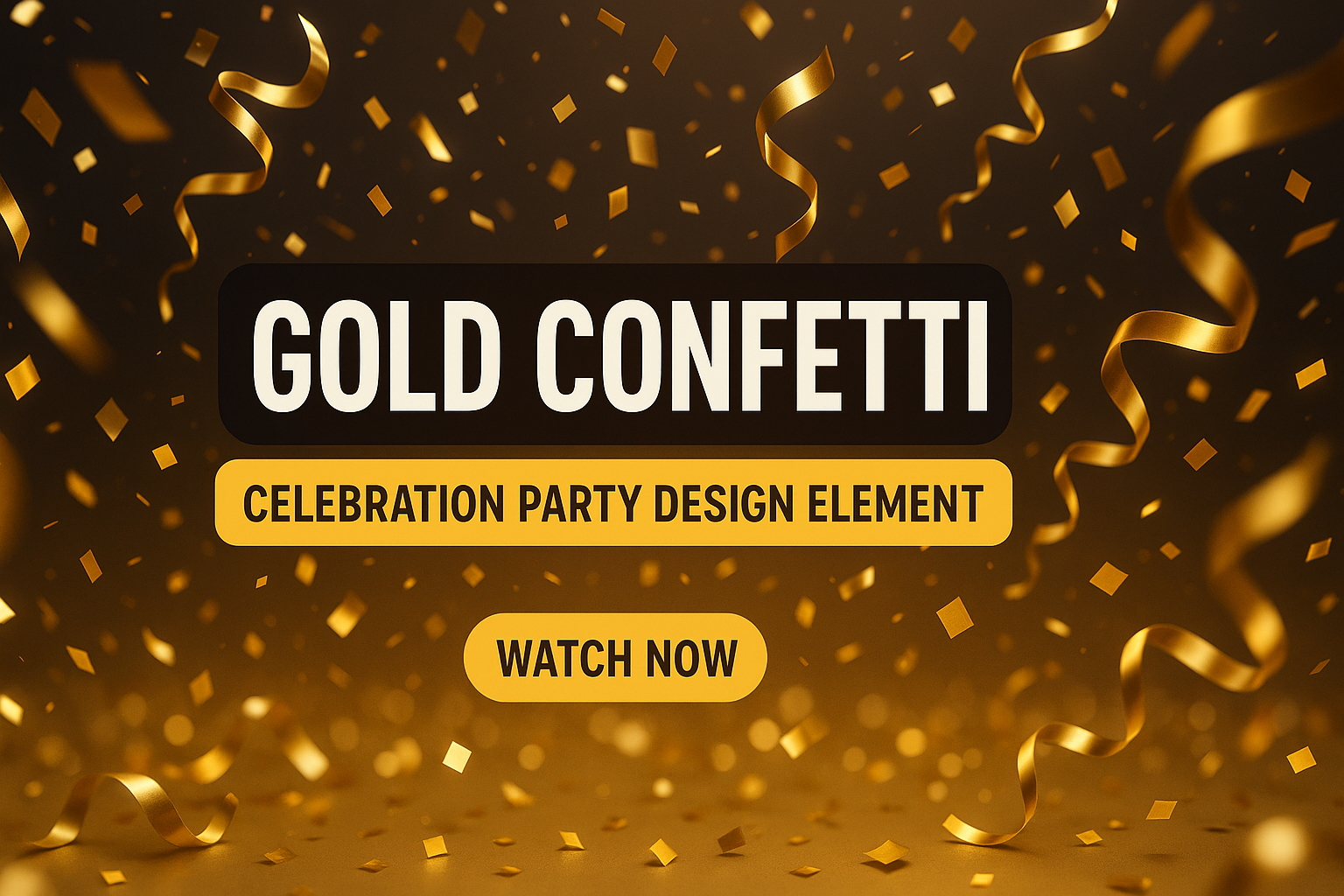 A vibrant graphic featuring gold confetti and ribbons, ideal for party invitations or celebration promotions, designed to evoke a festive atmosphere.
