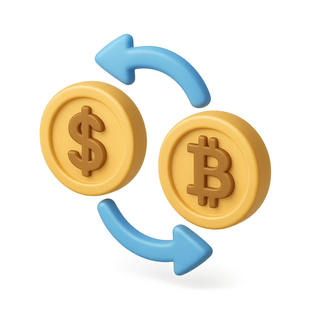 /Collection: /by davooda/Type: PNG/A visually appealing 3D icon showcasing a dollar coin and a bitcoin coin, featuring arrows indicating exchange. The design has a transparent background and a volumetric isometric perspective.