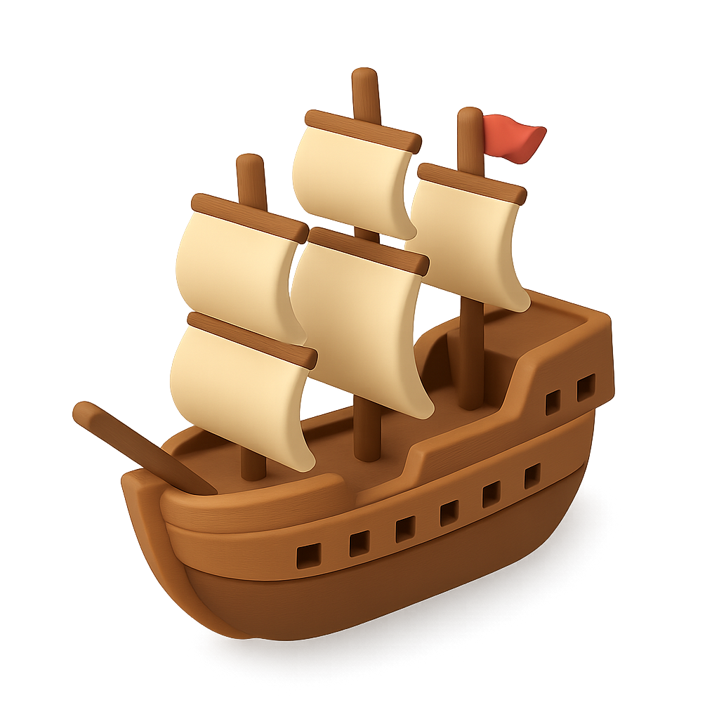 /Free/Collection: /by davooda/Type: PNG/A vibrant 3D icon depicting a classic sailing ship with three sails, a wooden hull, and a red flag. The design showcases smooth textures and a playful aesthetic.