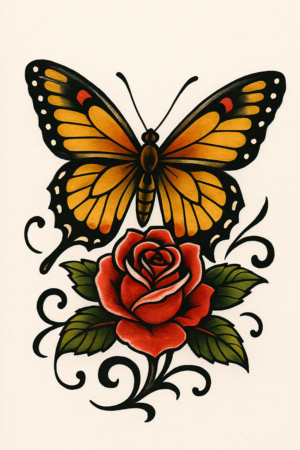 Stylized tattoo artwork showcasing a butterfly above a rose, featuring bold colors and intricate line work, ideal for tattoo inspiration or art display.