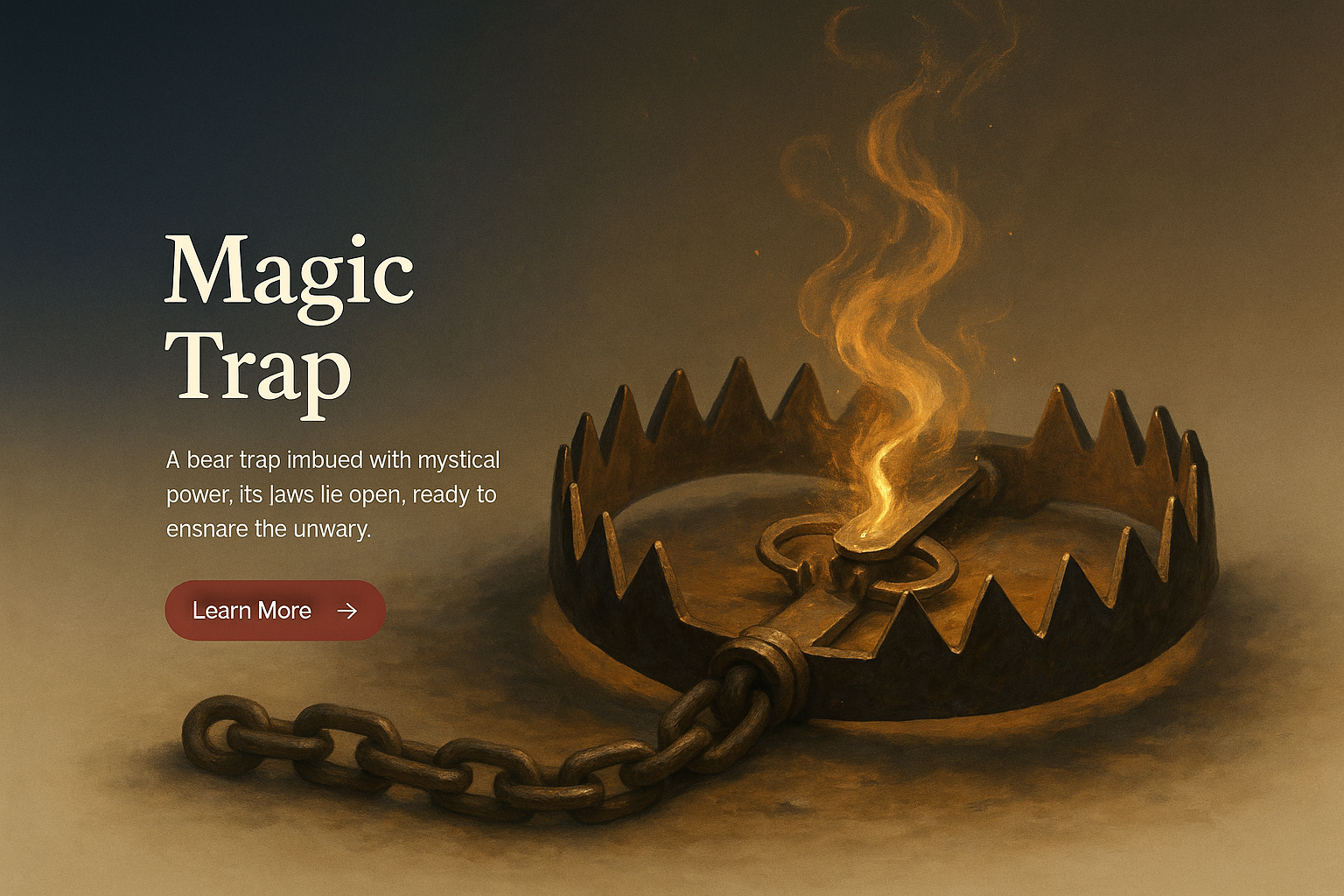 /Collection: /by davooda/Type: PNG/A realistic digital illustration of a bear trap emanating mystical flames, with a clean gradient background. The design features a prominent title and a call-to-action button.