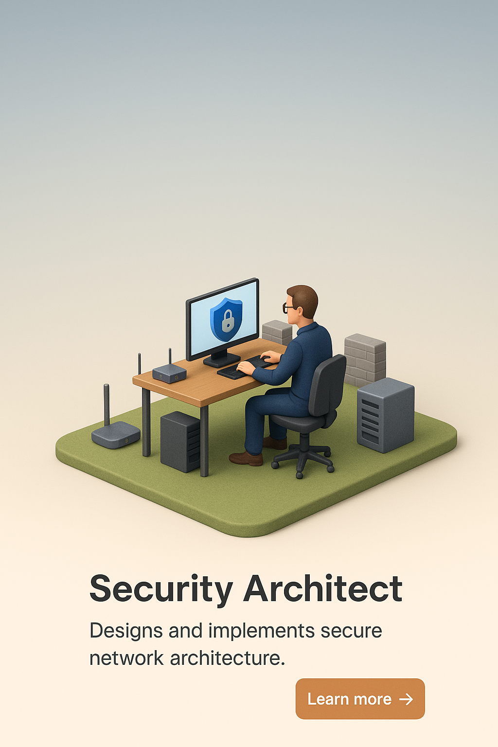 A realistic 3D scene depicting a security architect working at a desk, showcasing network architecture design elements. The background features a smooth gradient transitioning to a solid color.