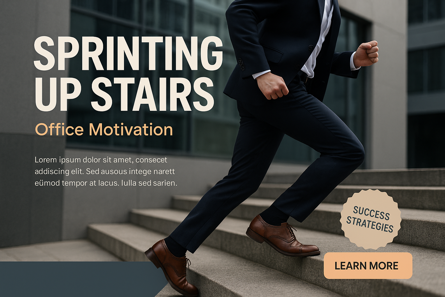/Collection: /by davooda/Type: PNG/A close-up shot of a young businessman in formal attire sprinting up stairs in an office environment, showcasing determination and motivation. The image features a professional design layout.