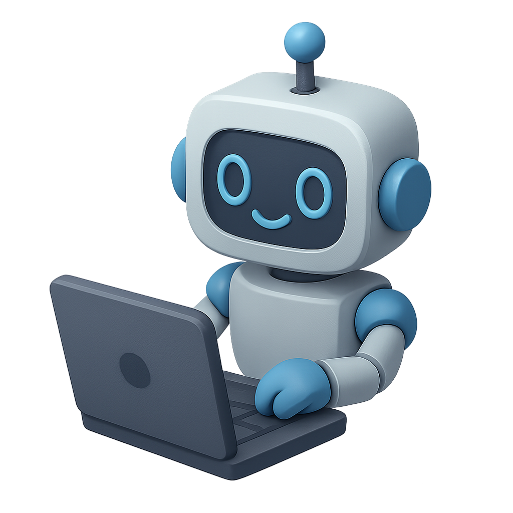 A friendly 3D robot sitting at a laptop, depicted in a three-quarter isometric view. The robot features a smiling face and blue accents, creating a cheerful tech vibe.