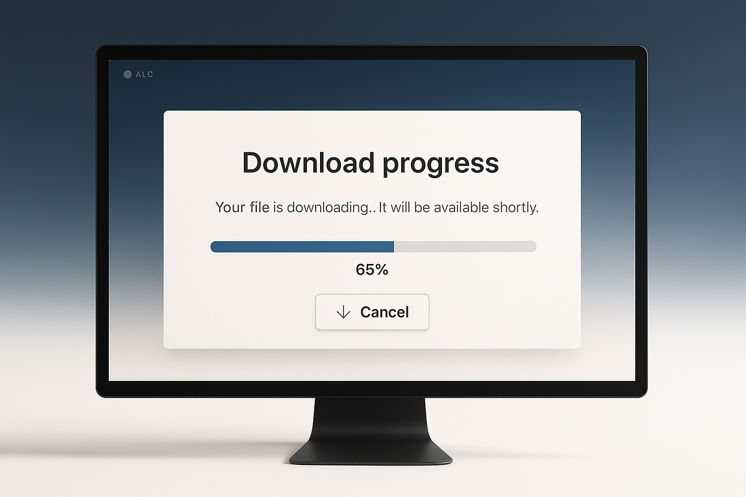 A realistic download progress interface displayed on a large monitor. It shows a progress bar at 65% completion, with a cancel button and informative text.