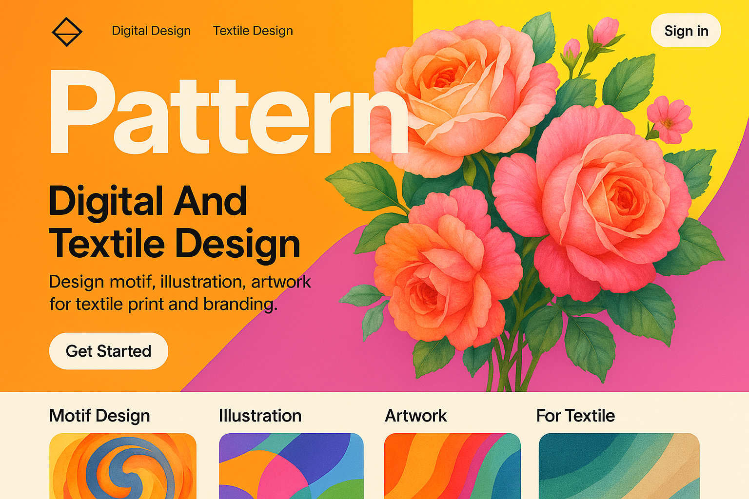 /Collection: /by davooda/Type: PNG/A vibrant and modern landing page design showcasing watercolor roses with bold typography. The layout includes large color blocks, a dynamic headline, and sections for digital and textile design.