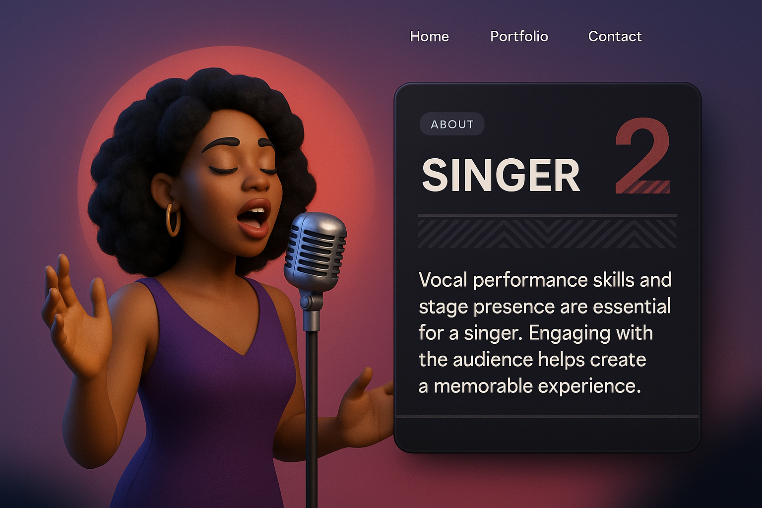 /Collection: /by davooda/Type: PNG/A 3D illustration of a singer performing with a microphone, set against a gradient background. The design includes a dark information panel with text about singing skills.