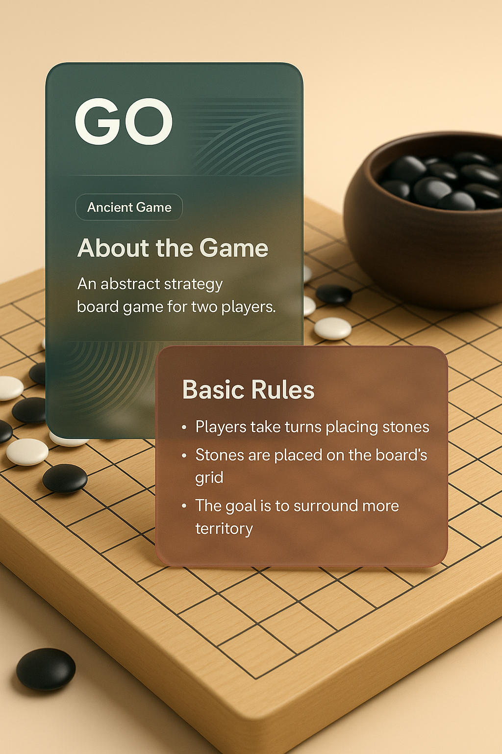 A modern 3D illustration showcasing the board game Go, featuring two integrated info blocks with a gradient background. The design emphasizes clarity and readability.