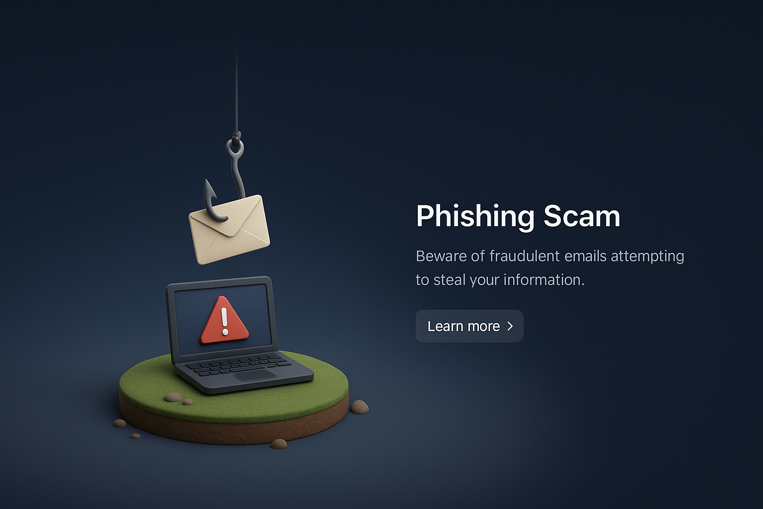 A detailed 3D scene depicting a phishing scam alert with a laptop, warning sign, and a fishing hook. The dark gradient background enhances visibility of the elements.