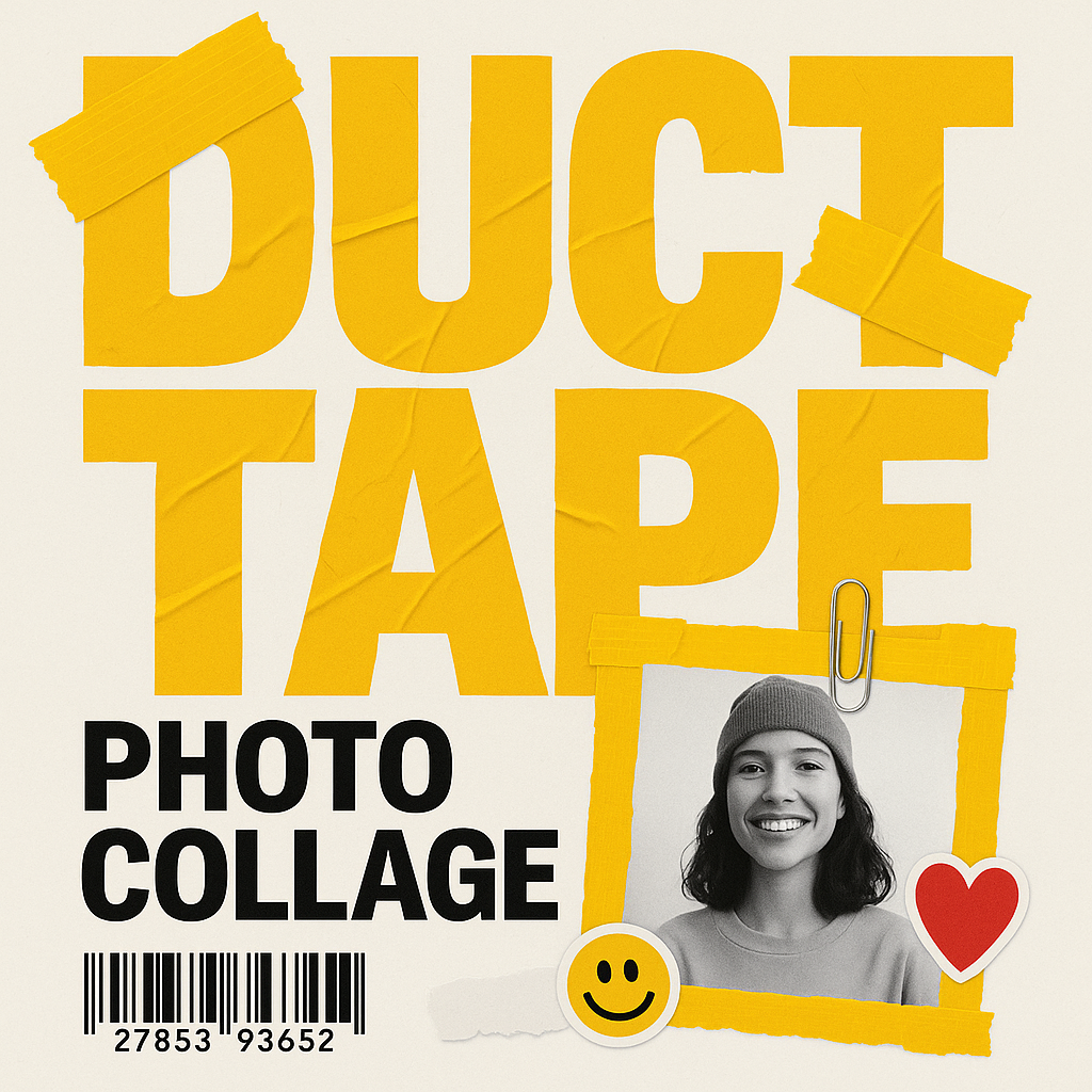 Innovative photo collage design utilizing duct tape elements and playful graphics, ideal for social media posts or personal branding.