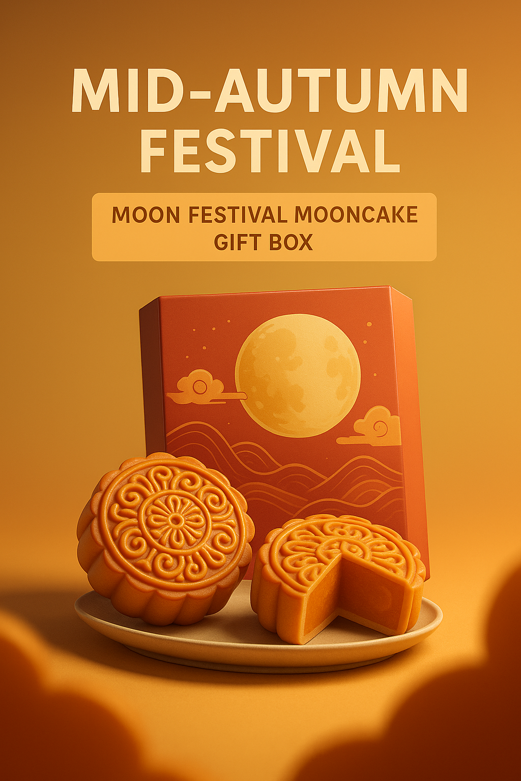This graphic features a beautifully designed mooncake gift box for the Mid-Autumn Festival. The warm color palette and elegant visuals cater to festive celebrations.