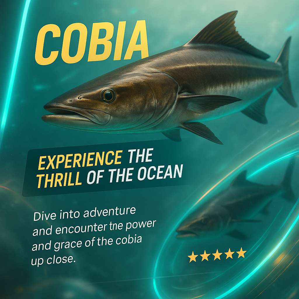 /Collection: /by davooda/Type: PNG/A visually striking advertising slide showcasing a Cobia fish, emphasizing ocean thrill. The design features neon accents, layered elements, and a compelling message.