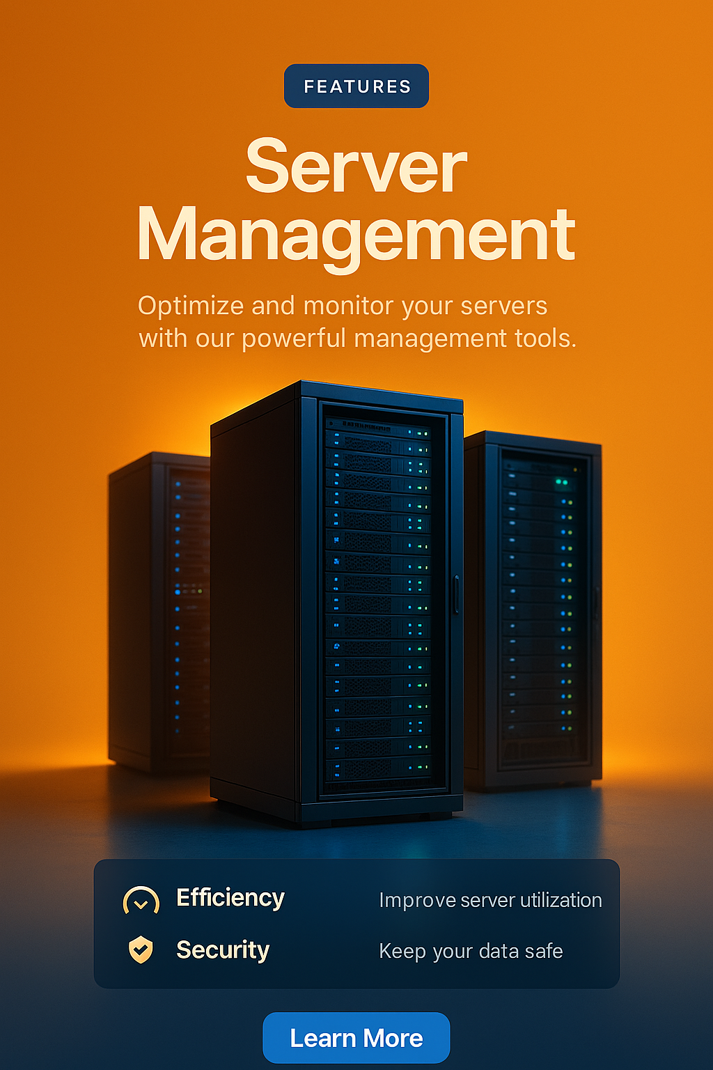 /Collection: /by davooda/Type: PNG/This is a promotional graphic for server management features, showcasing a sleek server setup with a modern design. Ideal for tech companies targeting IT professionals.