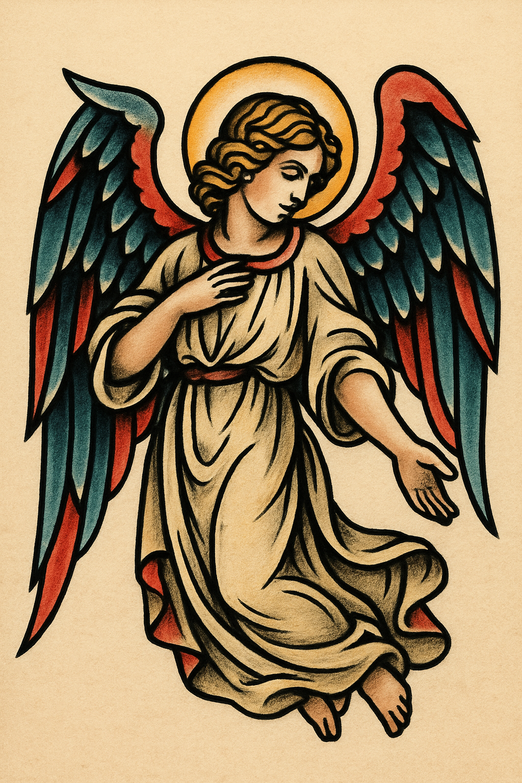 This is a vibrant illustration of an angel featuring detailed wings and a flowing robe, ideal for use in religious or spiritual contexts. The artwork showcases a classic, stylized design.