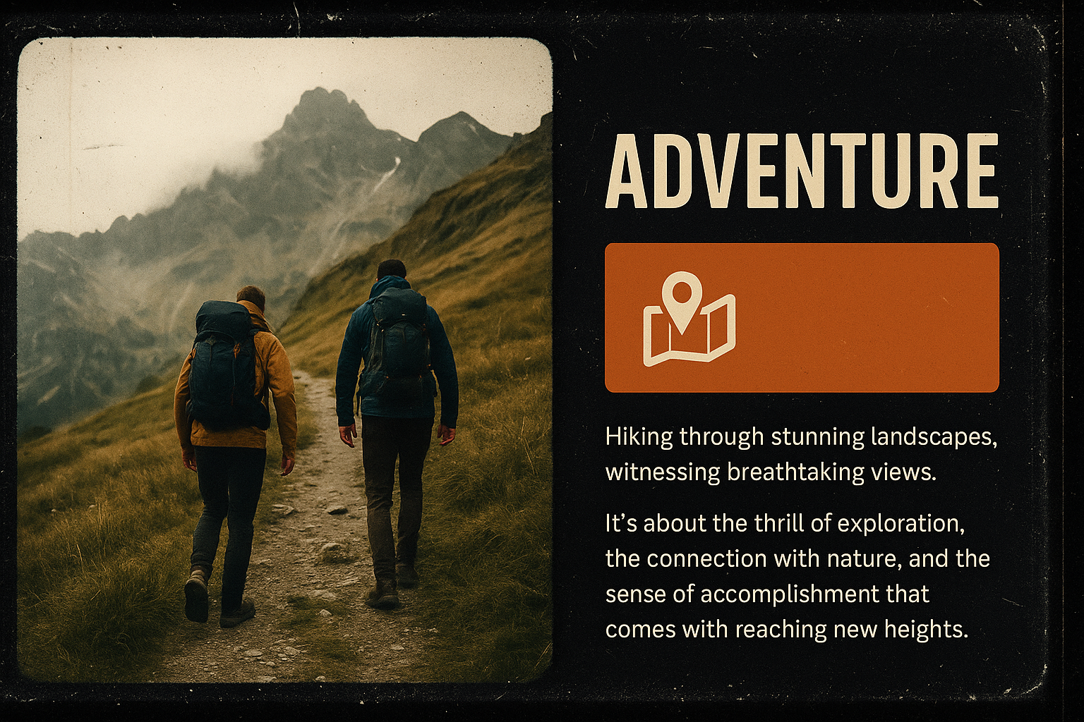 A visually engaging graphic showcasing two hikers exploring a mountainous landscape, embodying the thrill of adventure and connection with nature, ideal for outdoor or travel marketing.