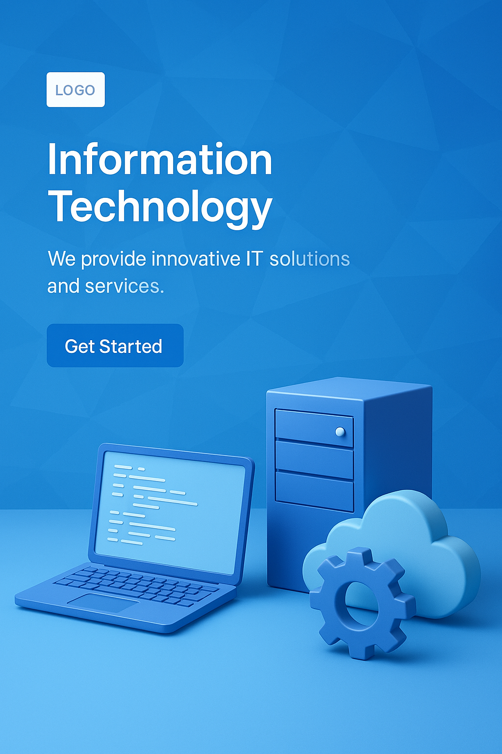 A visually appealing background for an IT company featuring 3D illustrations of a laptop, server, and cloud icon, all in blue tones, with a clean layout for text and action button.