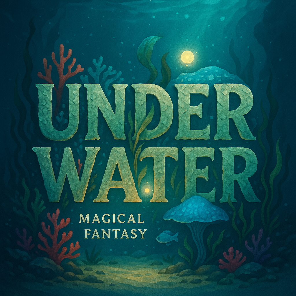 Vibrant underwater scene featuring whimsical typography and luminous marine elements, ideal for children's book covers or fantasy-themed projects.