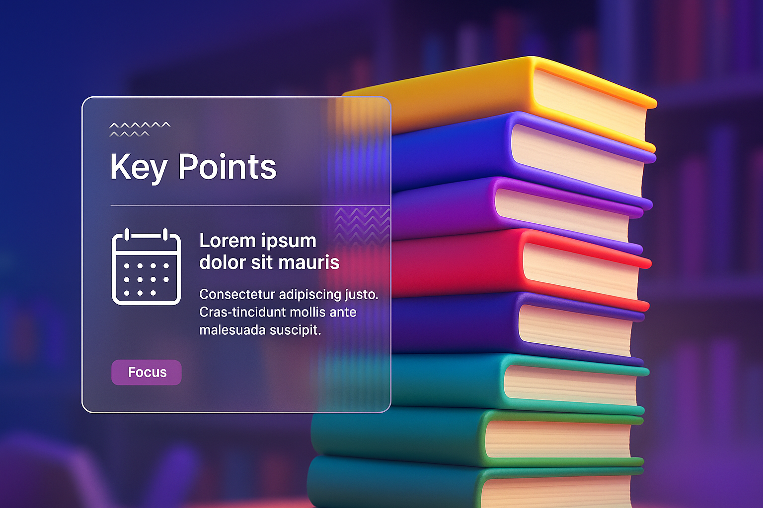 A vibrant stack of colorful books is displayed in a library setting, featuring a translucent overlay with key points and graphics, enhancing the visual appeal.