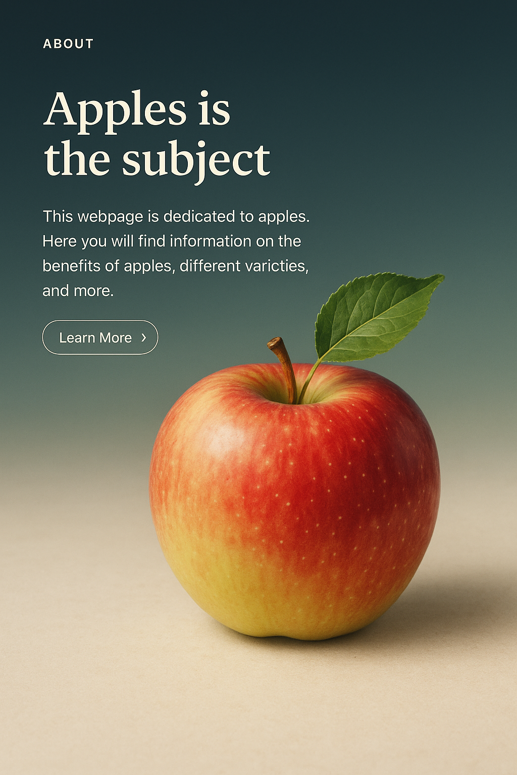 A stylish web page design showcasing a realistic apple. The composition features a gradient background, a clear title, and a text block with a call-to-action button.