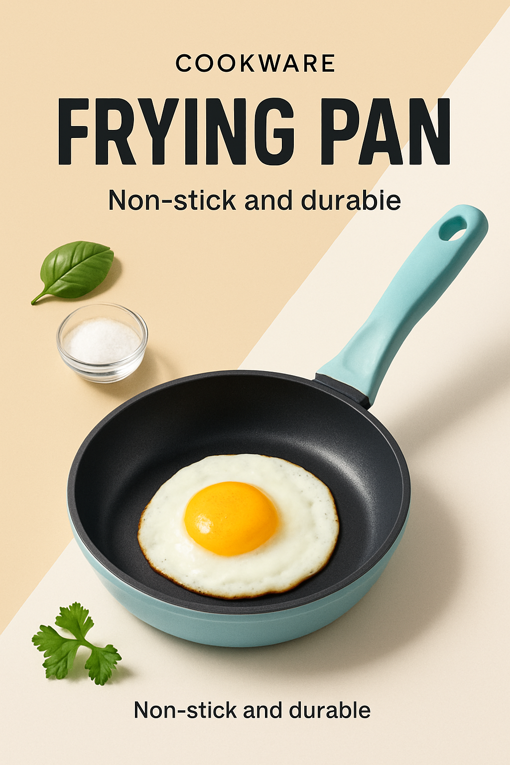 A vibrant image showcasing a stylish frying pan with an egg on a sunny kitchen backdrop. The modern design highlights the pan's non-stick feature, emphasizing a dynamic and clean aesthetic.
