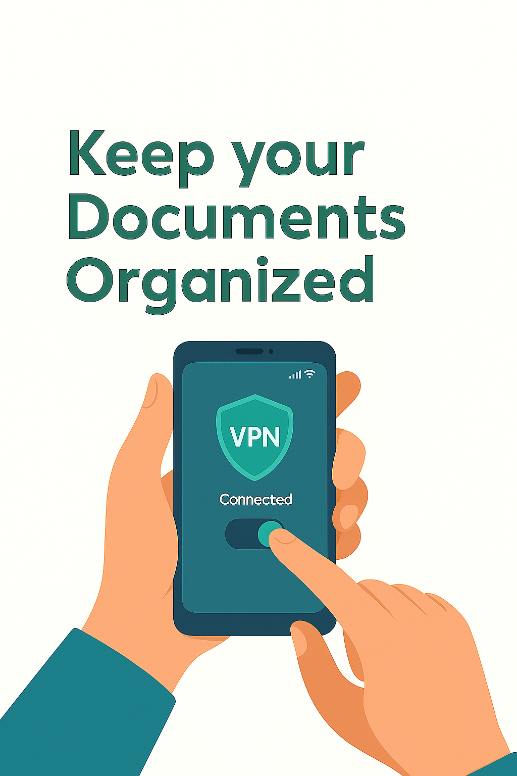/Collection: /by davooda/Type: PNG/Illustrative graphic showcasing a mobile phone interface emphasizing the importance of document organization with added VPN security. Ideal for tech-related marketing.
