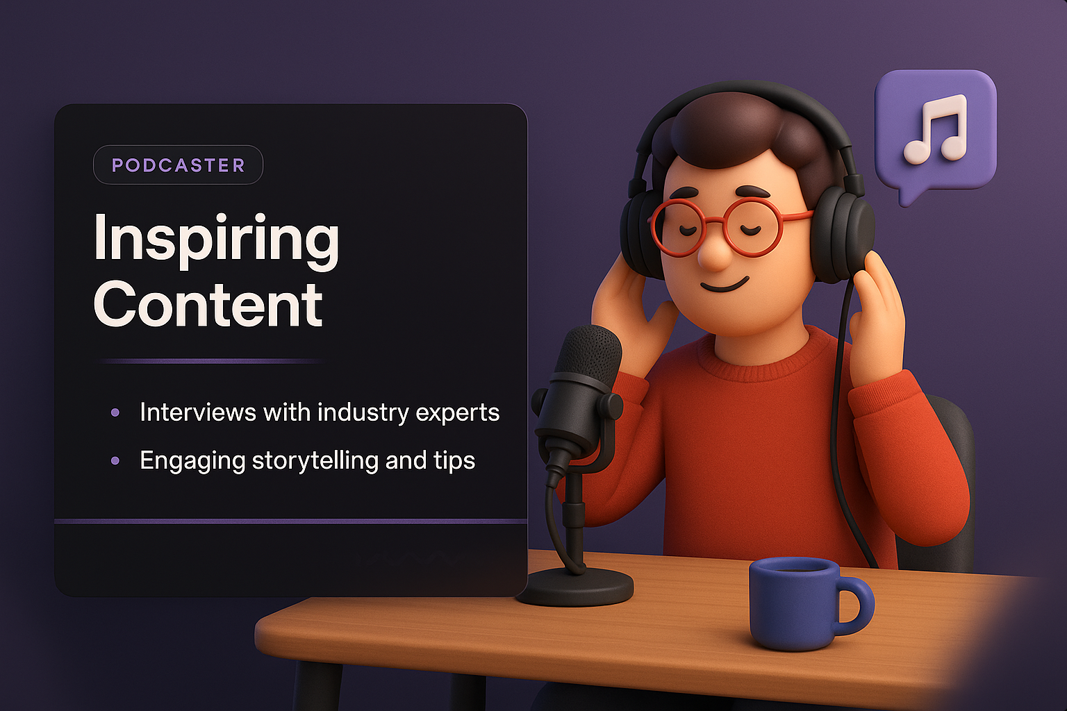 /Collection: /by davooda/Type: PNG/A vibrant 3D illustration of a podcaster wearing headphones, engaging with inspiring content. The scene includes a stylish dark panel with text, enhancing the podcast theme.