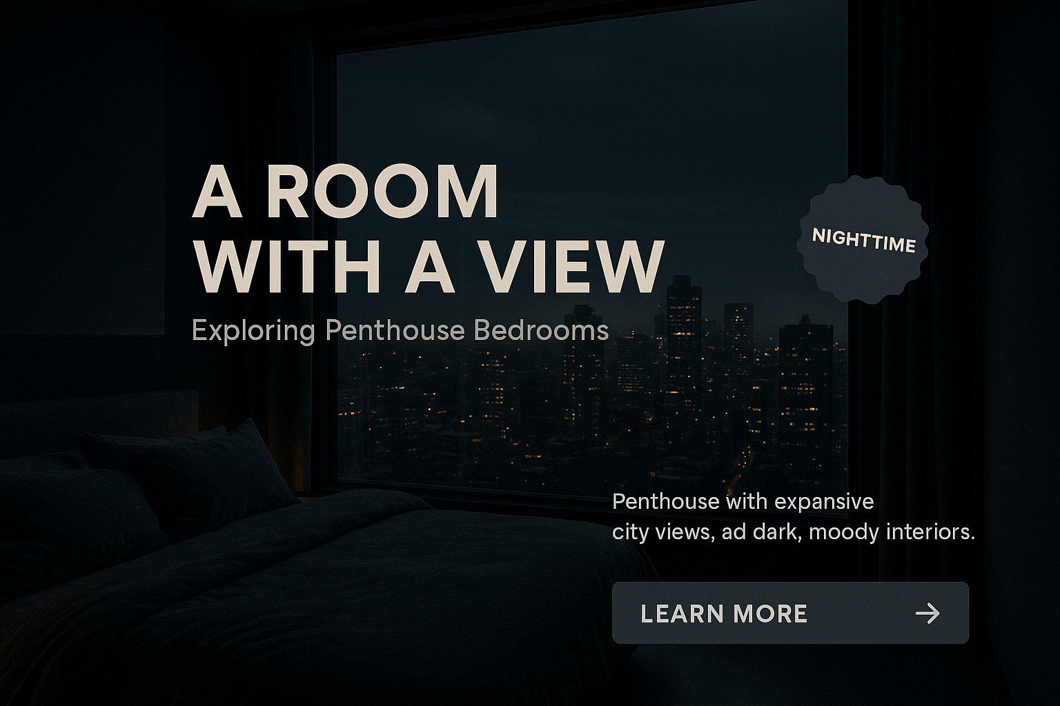 A luxurious penthouse bedroom featuring a stunning city view at night. The dark, moody atmosphere is complemented by elegant design elements and a clear call to action.