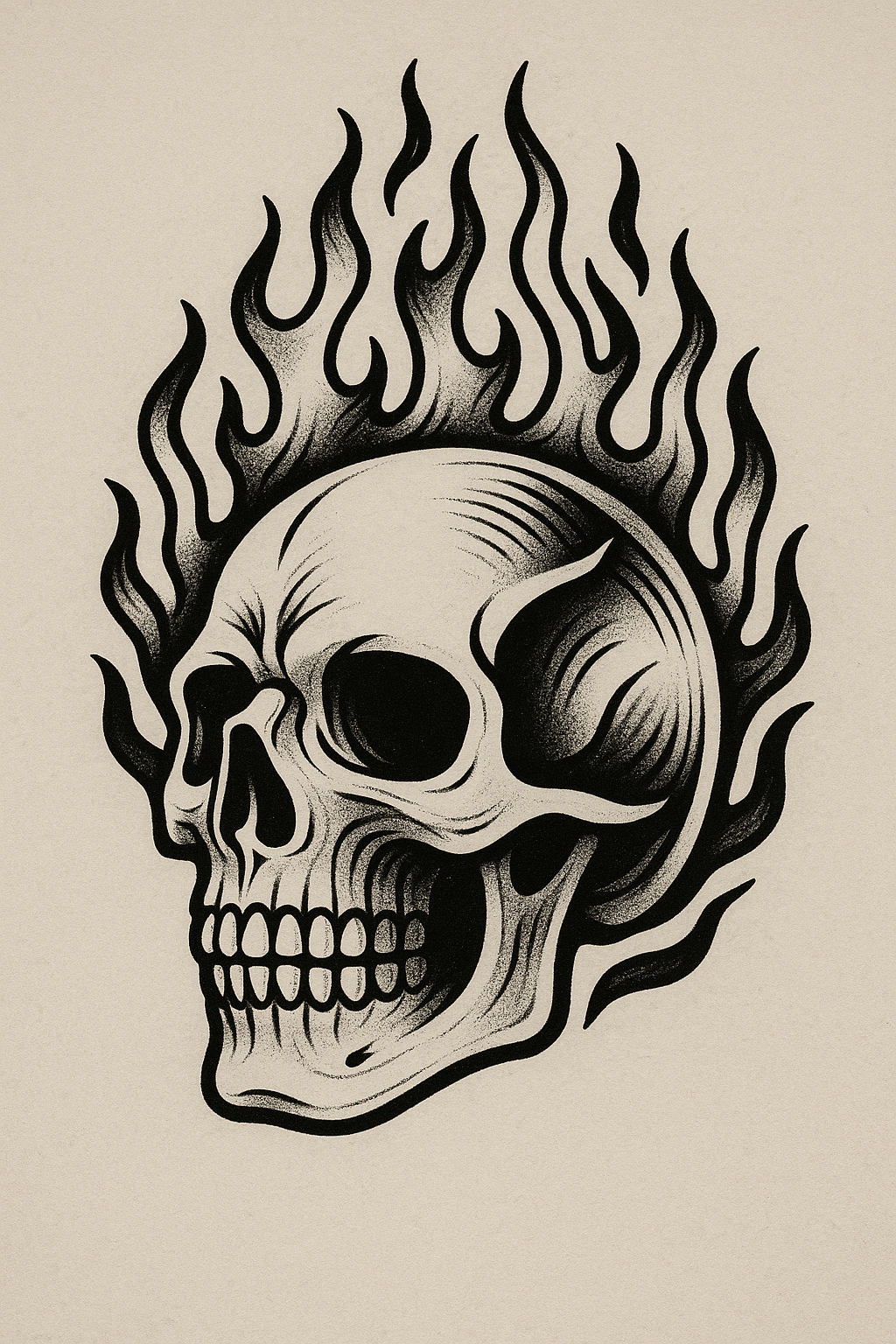 Stylized Skull with Flames Artwork for Tattoos or Merchandise