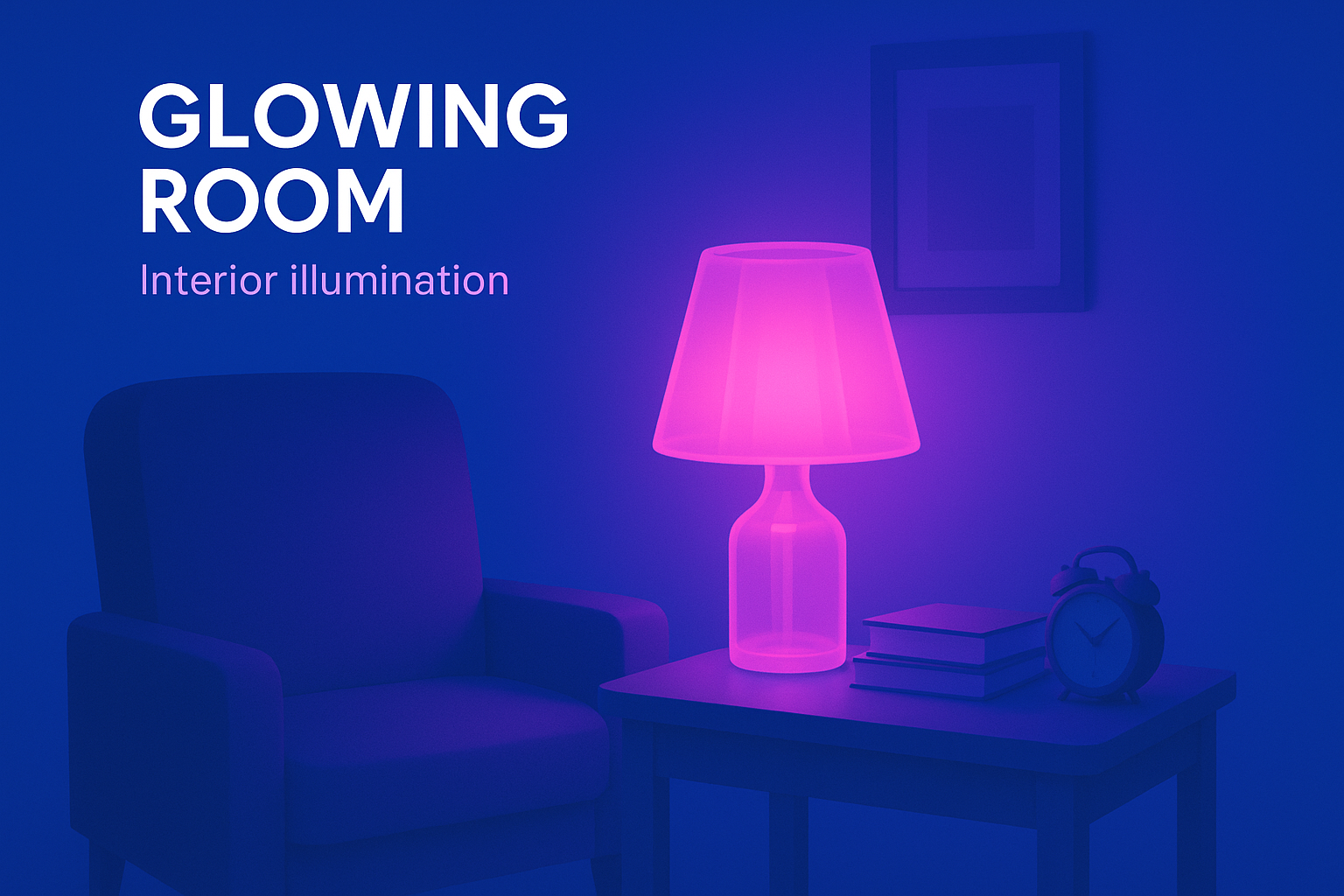 A cozy room featuring a glowing pink lamp, illuminating a chair and table with books and a clock. The blue background enhances the scene's atmosphere.