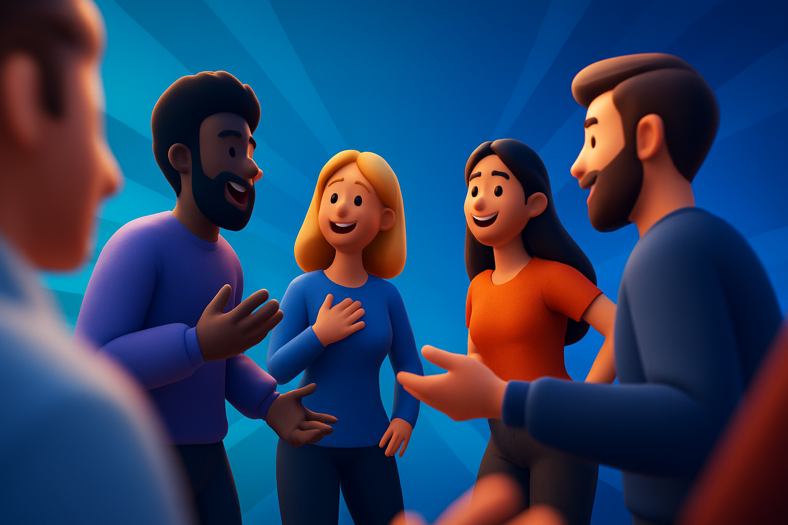 /Collection: /by davooda/Type: PNG/A lively scene depicting a group of diverse individuals engaging in conversation, showcasing animated expressions and warm interactions against a vibrant gradient background.