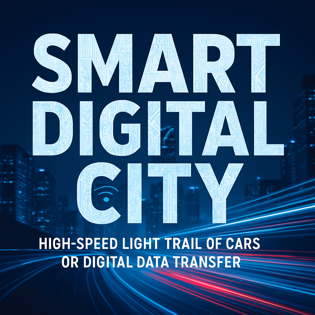 /Collection: /by davooda/Type: PNG/Dynamic graphic illustrating the concept of a smart digital city, blending high-speed light trails with urban elements, ideal for technology and urban development marketing.