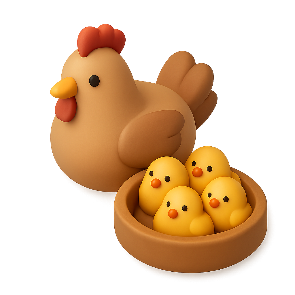 A delightful 3D icon showcasing a stylized chicken beside a bowl of four adorable yellow chicks, designed with a soft, isometric feel and a warm color palette.