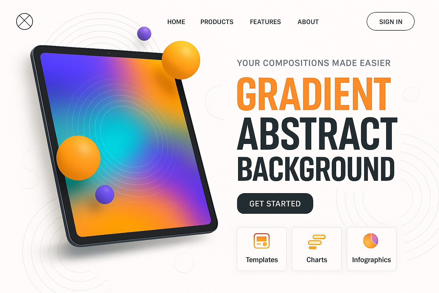 /Collection: /by davooda/Type: PNG/A vibrant, modern landing page featuring a tablet displaying colorful gradient graphics. Includes buttons, icons, and a structured layout with bold typography.