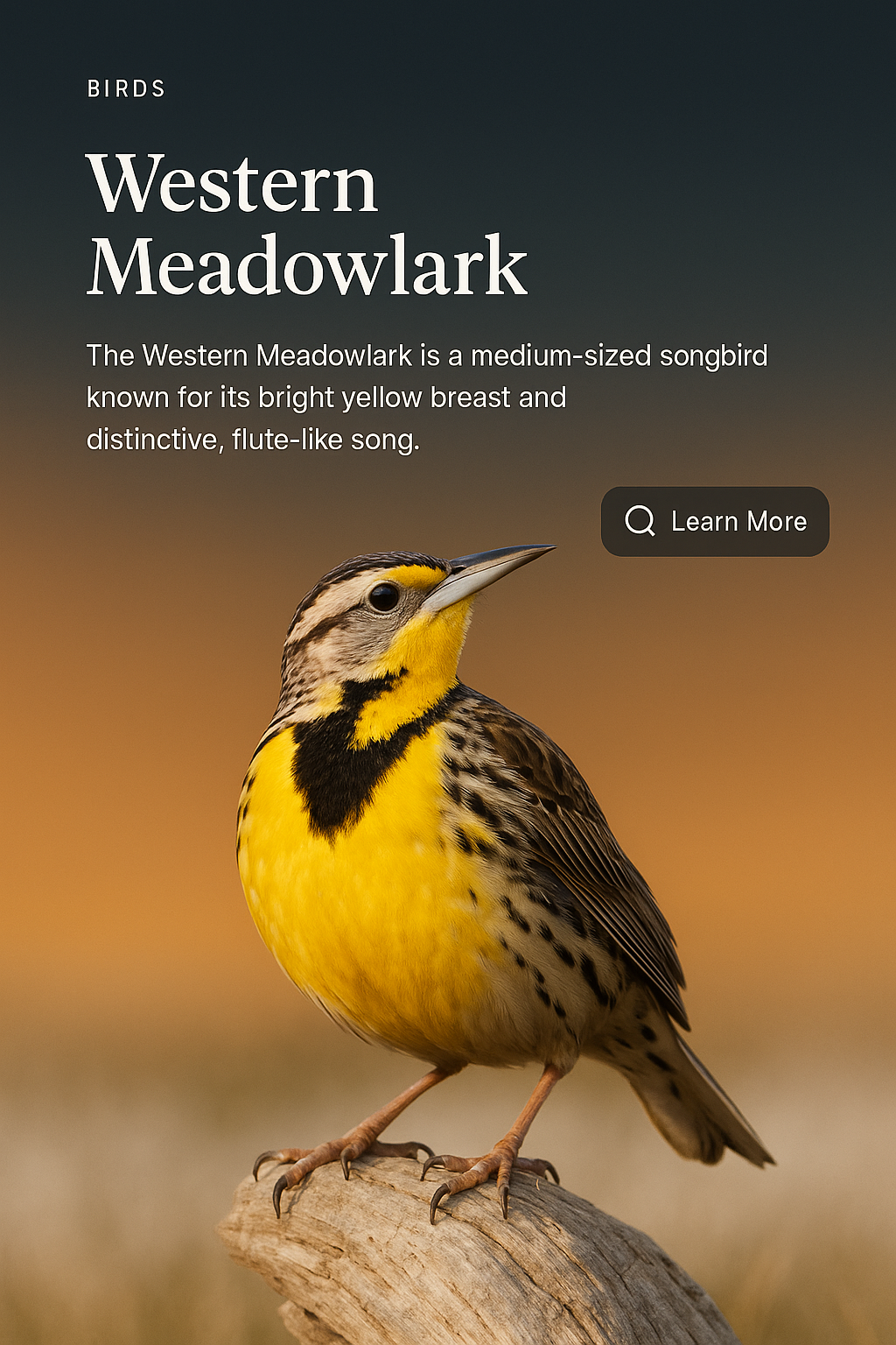 /Collection: /by davooda/Type: PNG/A stylish web page design showcasing a Western Meadowlark bird with a gradient background. Features a small label, a short title, a text block, and an action button.