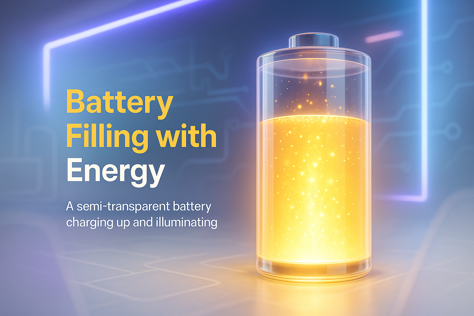 /Collection: /by davooda/Type: PNG/A modern digital illustration depicting a semi-transparent battery filling with energy, featuring glowing effects and vibrant colors, ideal for technology or energy-related content.