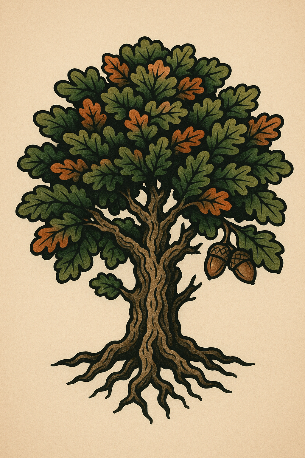 A detailed illustration of a tree with vibrant green and orange leaves, featuring acorns. This graphic has a vintage style, suitable for nature-themed decor or eco-friendly branding.