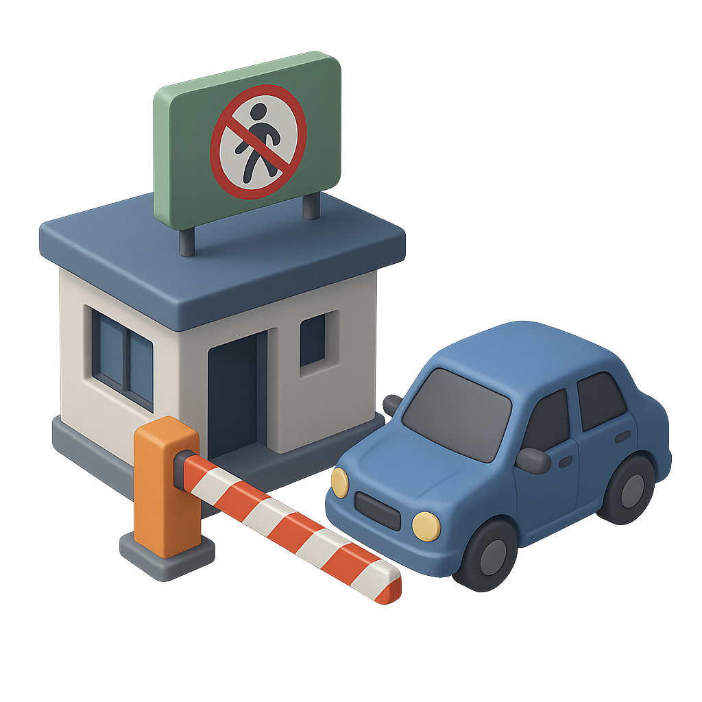 A three-dimensional icon depicting a border crossing scene. It features a small building, a barrier, and a blue car, all designed with a volumetric isometric style against a transparent background.