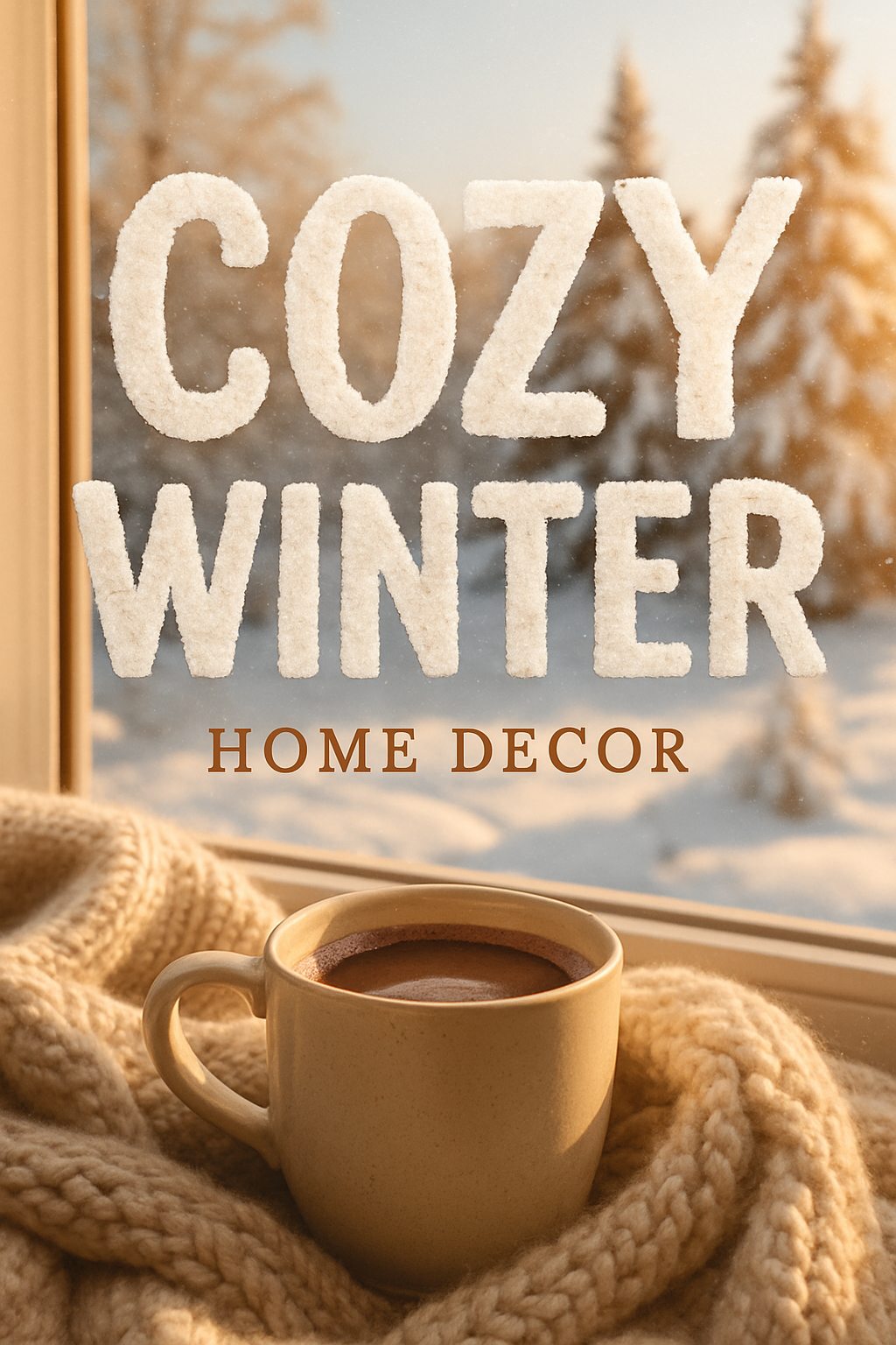 Charming winter-themed graphic showcasing a warm beverage by a window with snowy scenery, ideal for home decor inspiration and seasonal promotions.