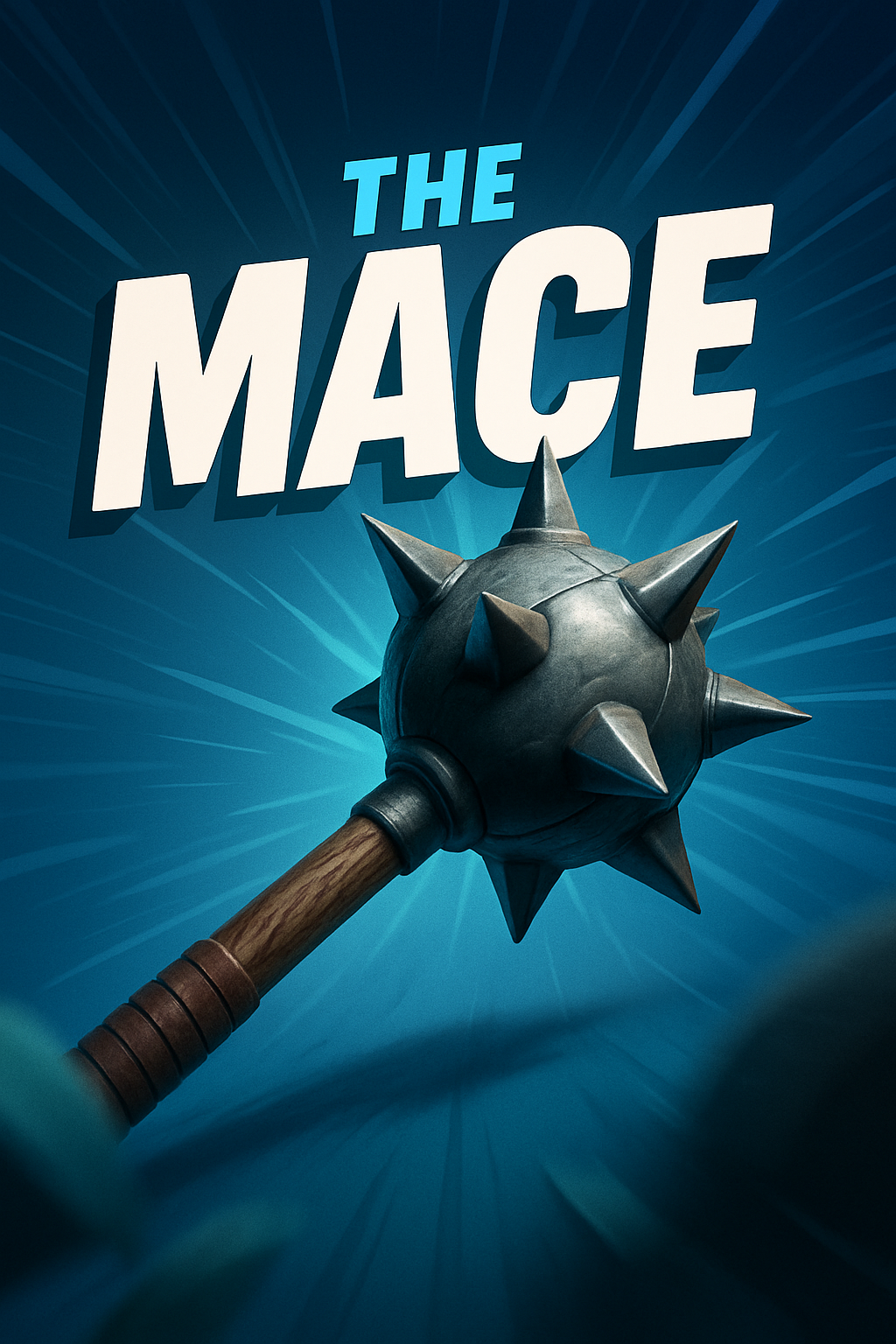 A striking 3D illustration of a mace, featuring dynamic lines radiating from the center. The background transitions smoothly from a gradient to a solid color, enhancing the mace's bold design.