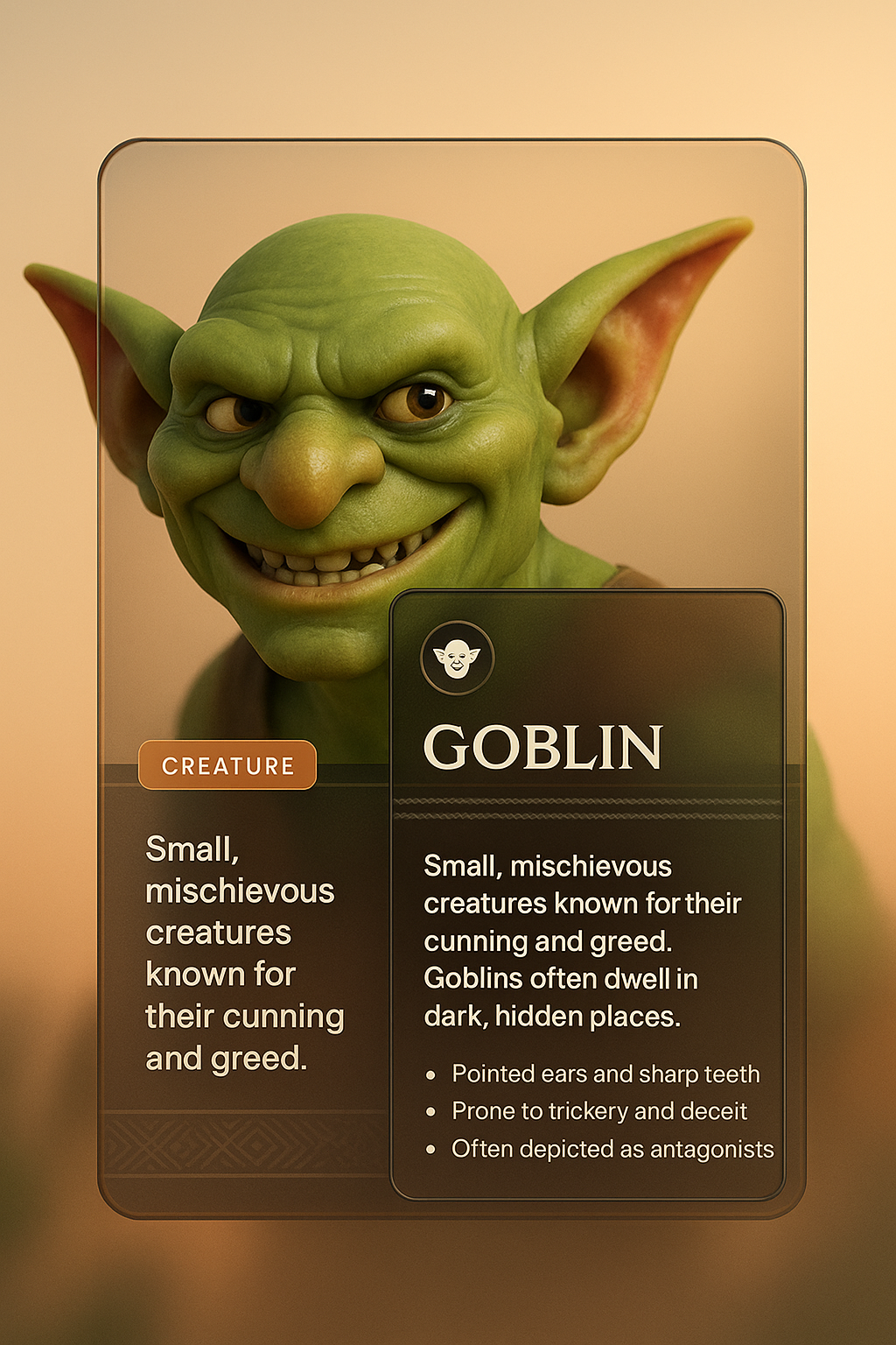 /Collection: /by davooda/Type: PNG/A 3D illustration of a goblin character with pointed ears and sharp teeth, accompanied by a well-integrated text block. The design features a smooth gradient background and cohesive layout.