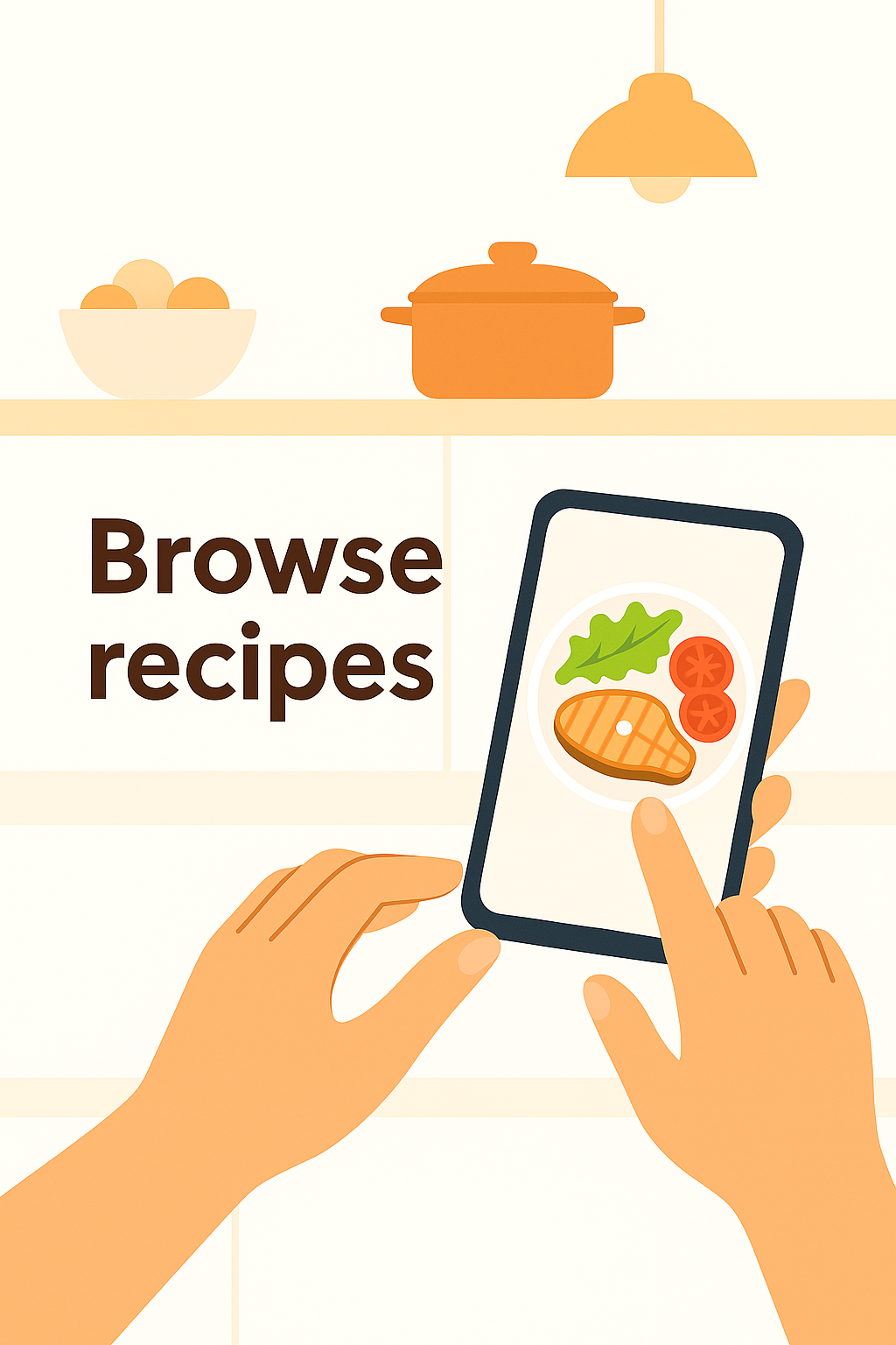Stylized graphic depicting a hand using a smartphone to browse recipes, set against a kitchen background. Ideal for food blogs or cooking apps.