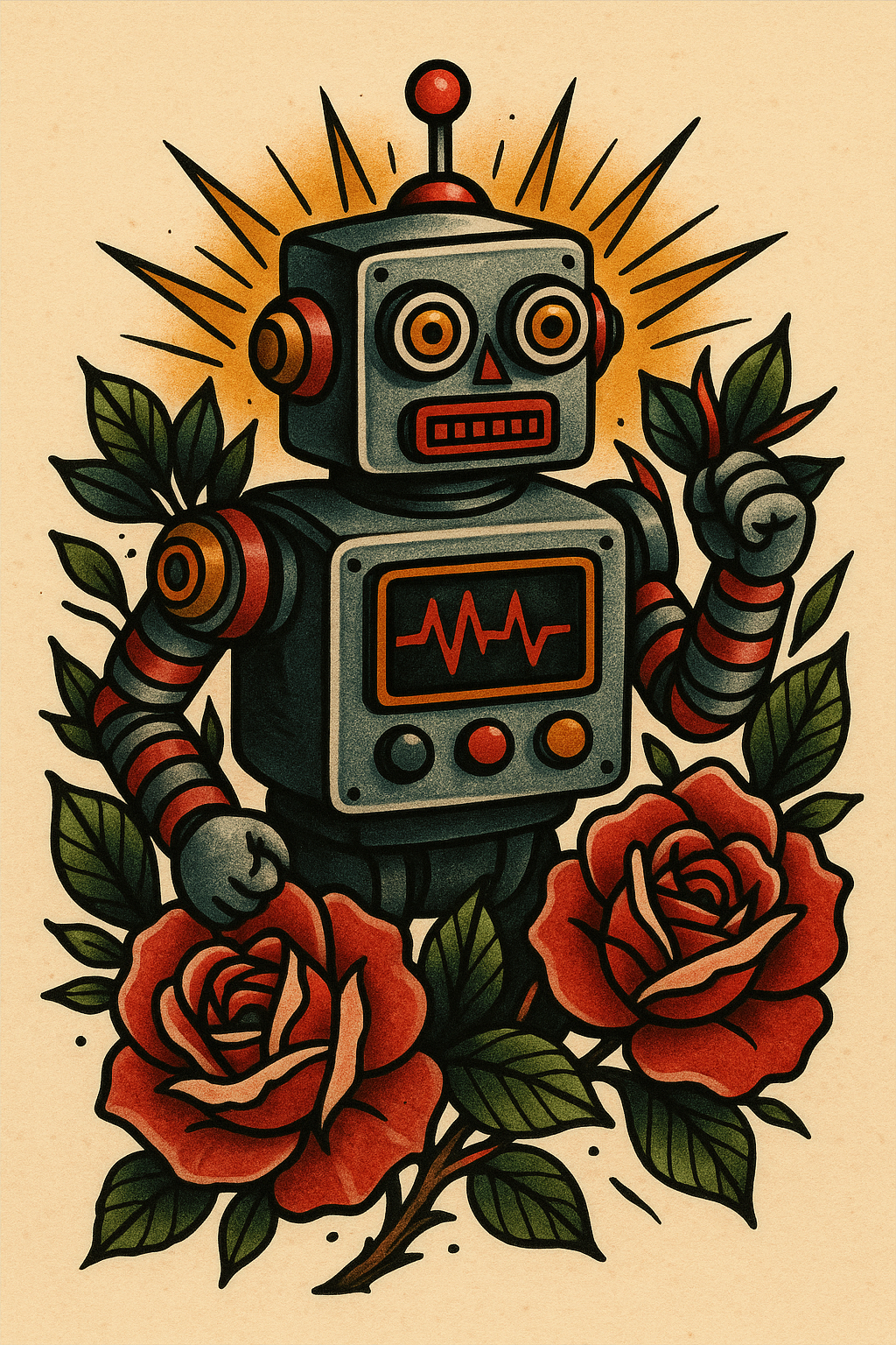 A colorful vintage-style illustration of a robot, adorned with roses, featuring bold outlines and a playful, retro aesthetic. Ideal for art prints and merchandise.